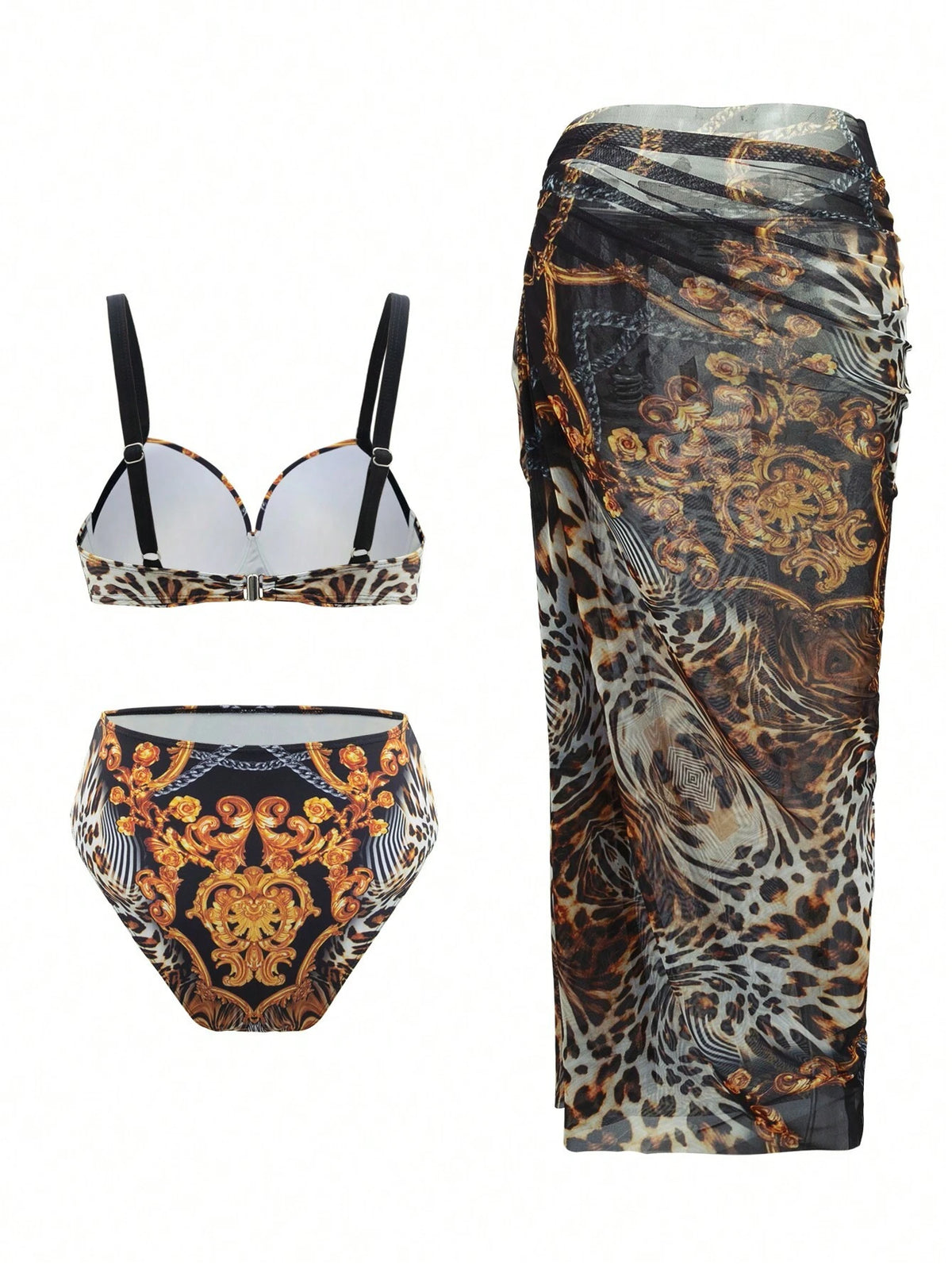 Swim Oasis Women's Baroque Printed Sexy Bikini Set For Vacation With Cover-Up Shirt And Skirt