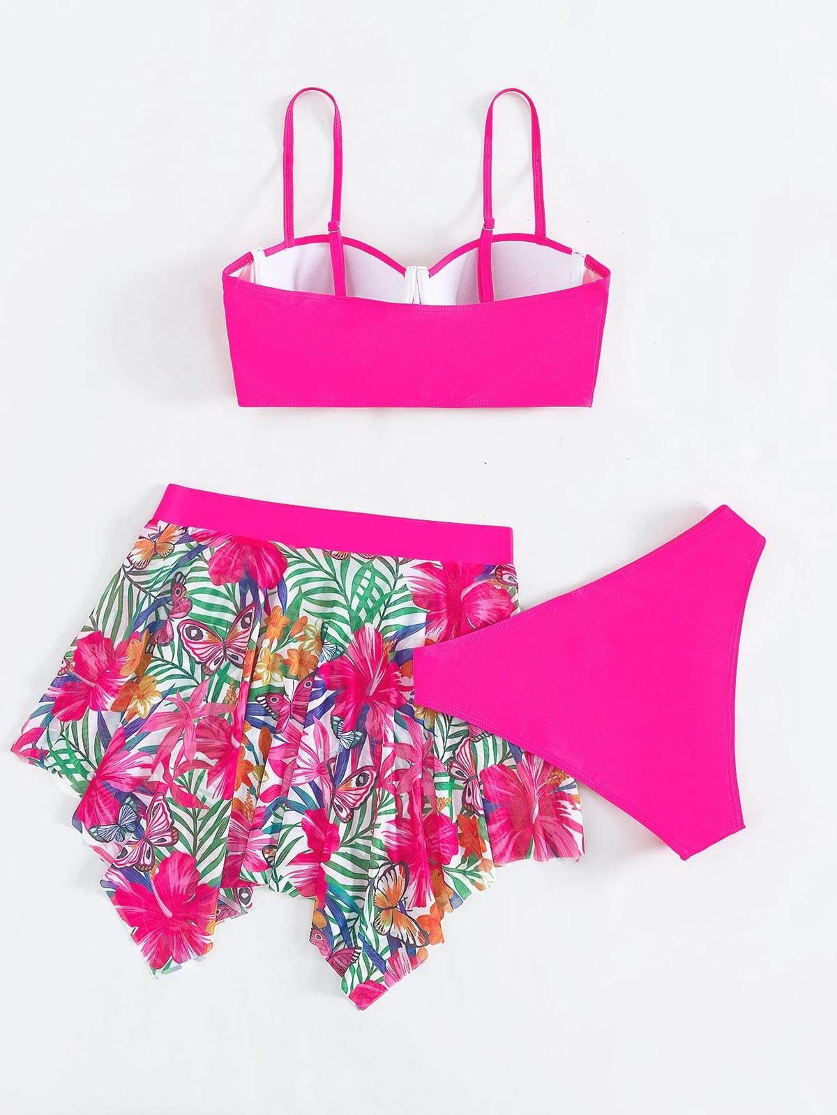 Inform when this item available Swim Tropical Print Bikini Set Push Up Bra Top & Bikini Bottom & Beach Skirt 3 Pieces Bikini