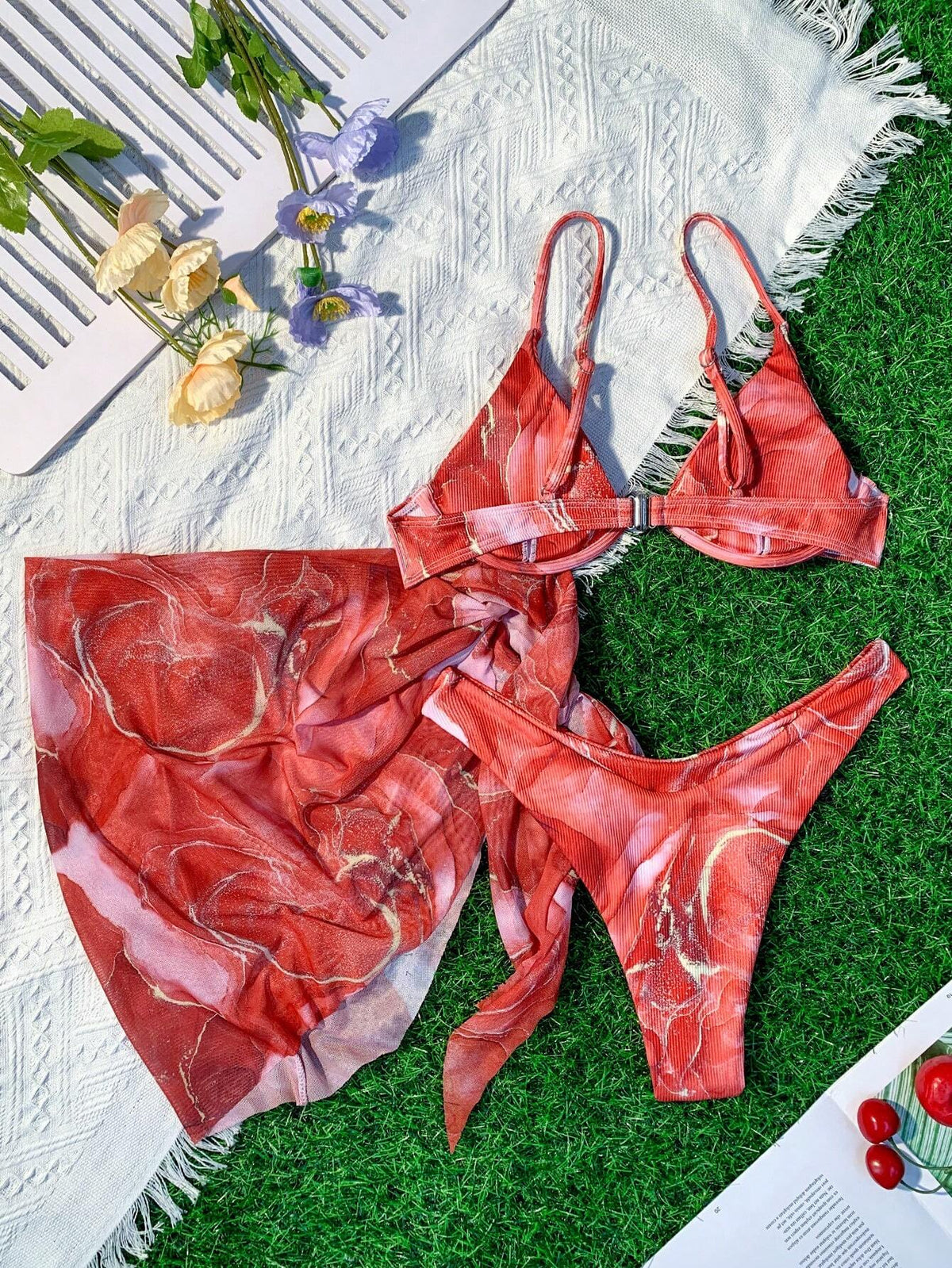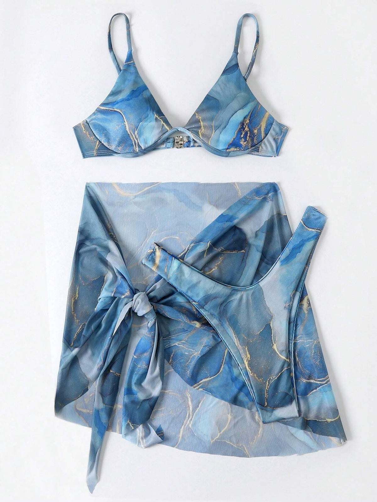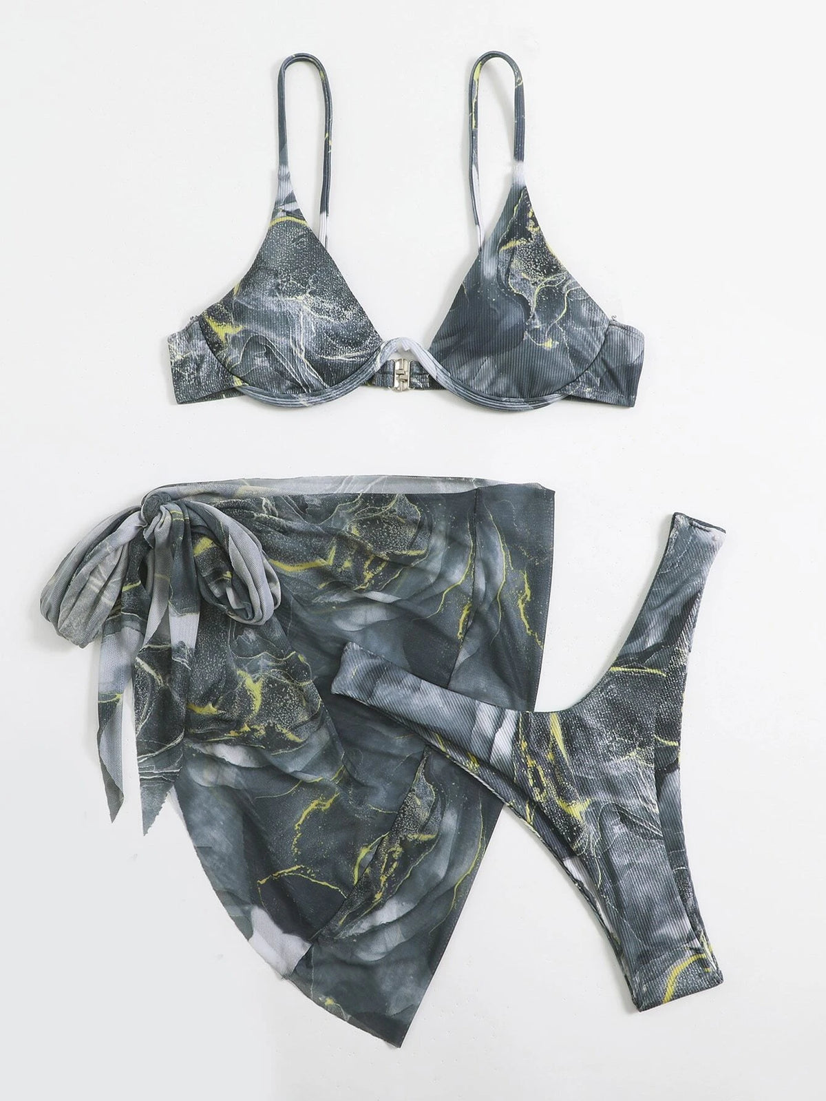 Swim Vcay Marble Print Ribbed Bikini Set Underwire Cami Bra & Cheeky Bottom & Beach Skirt 3 Piece Bathing Suit