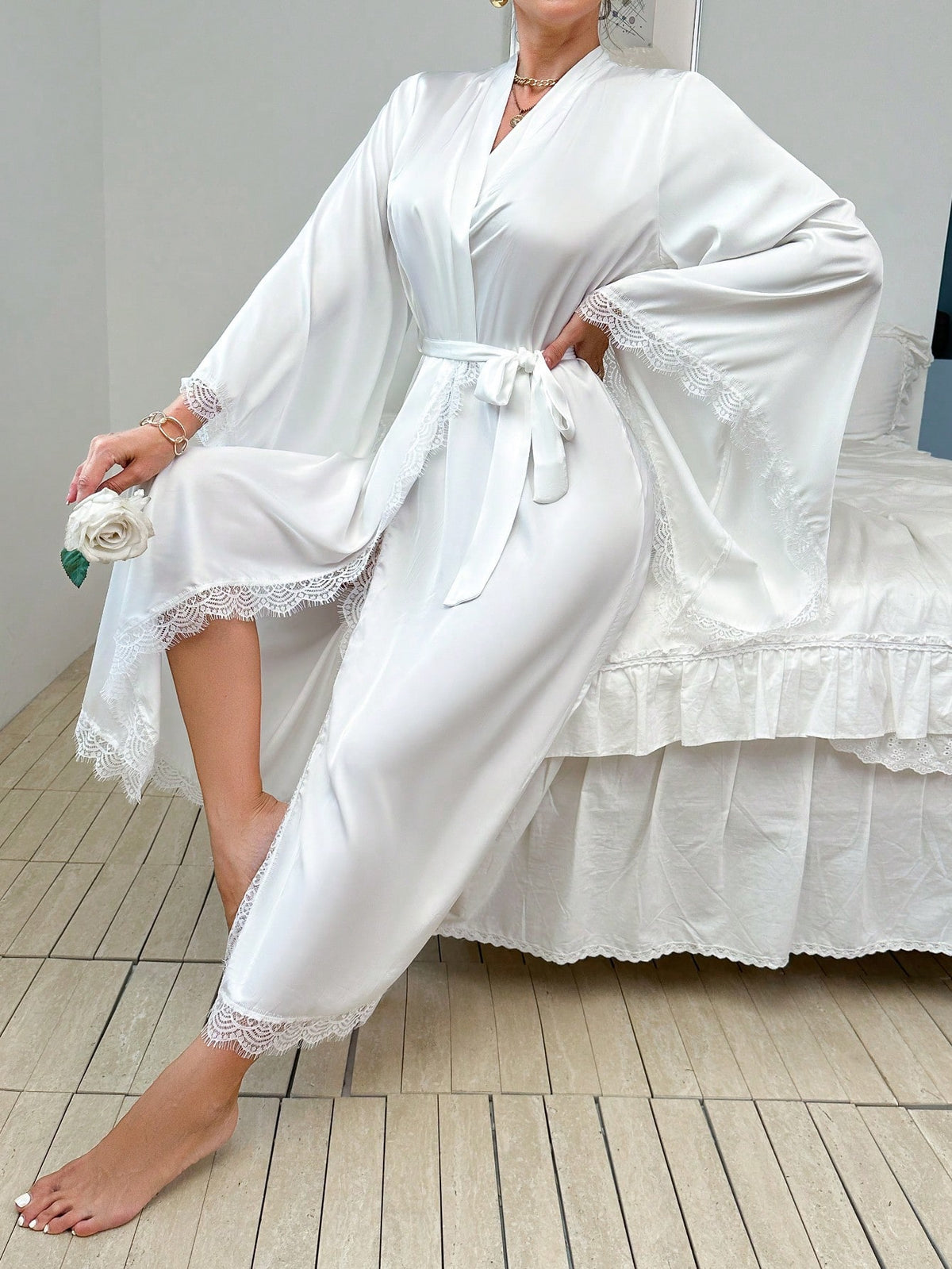 Inform when this item available Women Fashionable Lace Trim Black Batwing Sleeve Robe