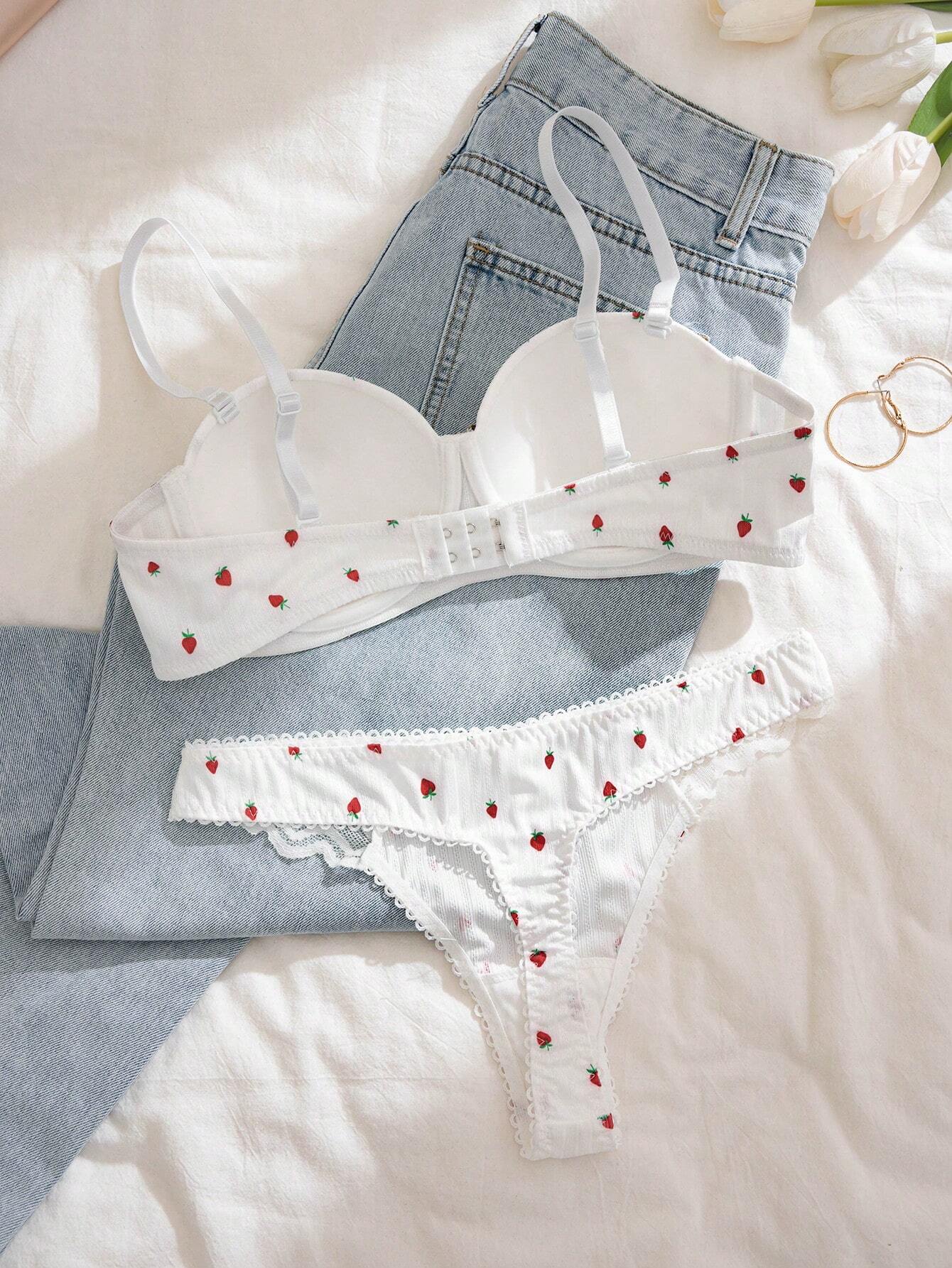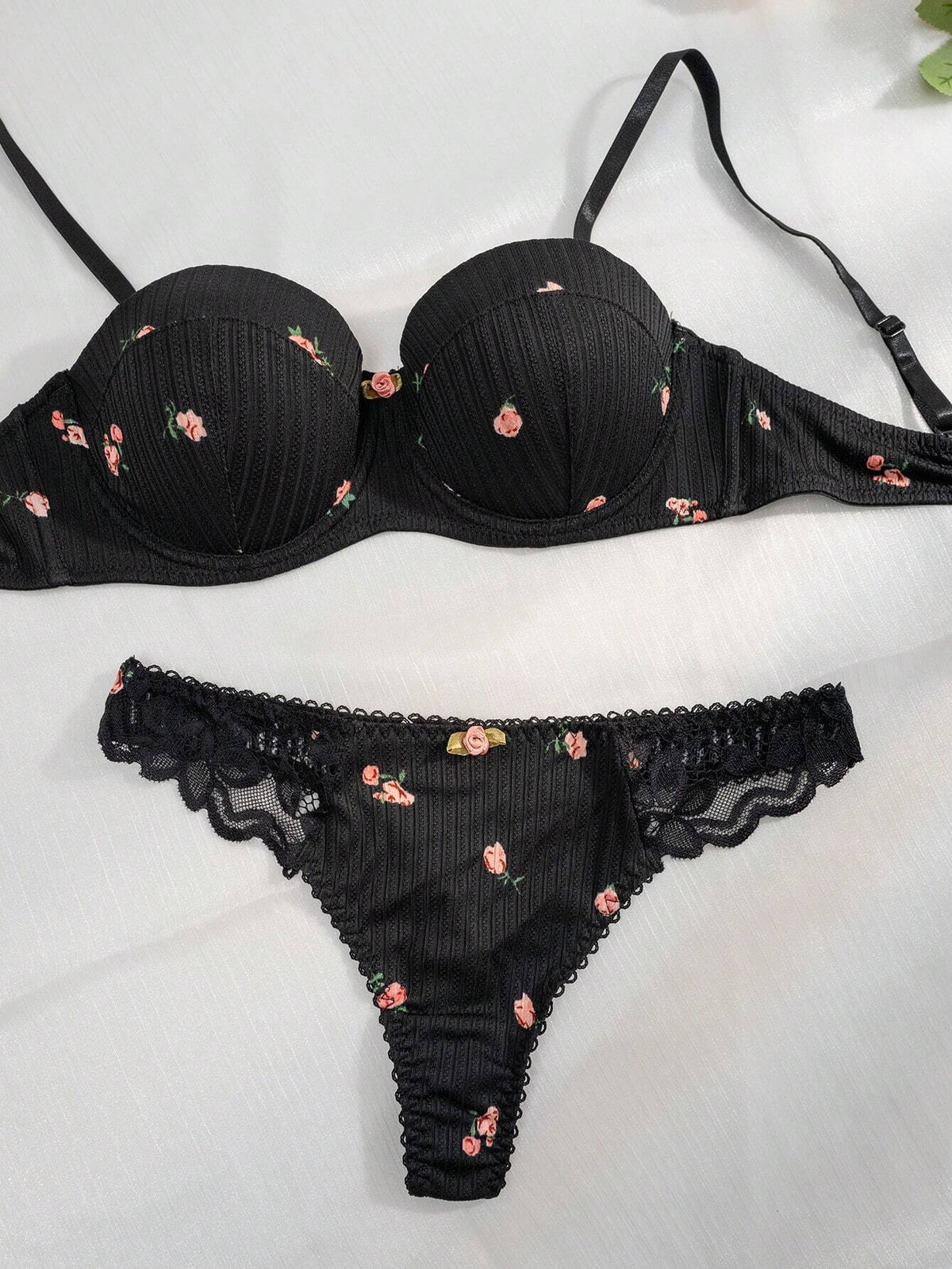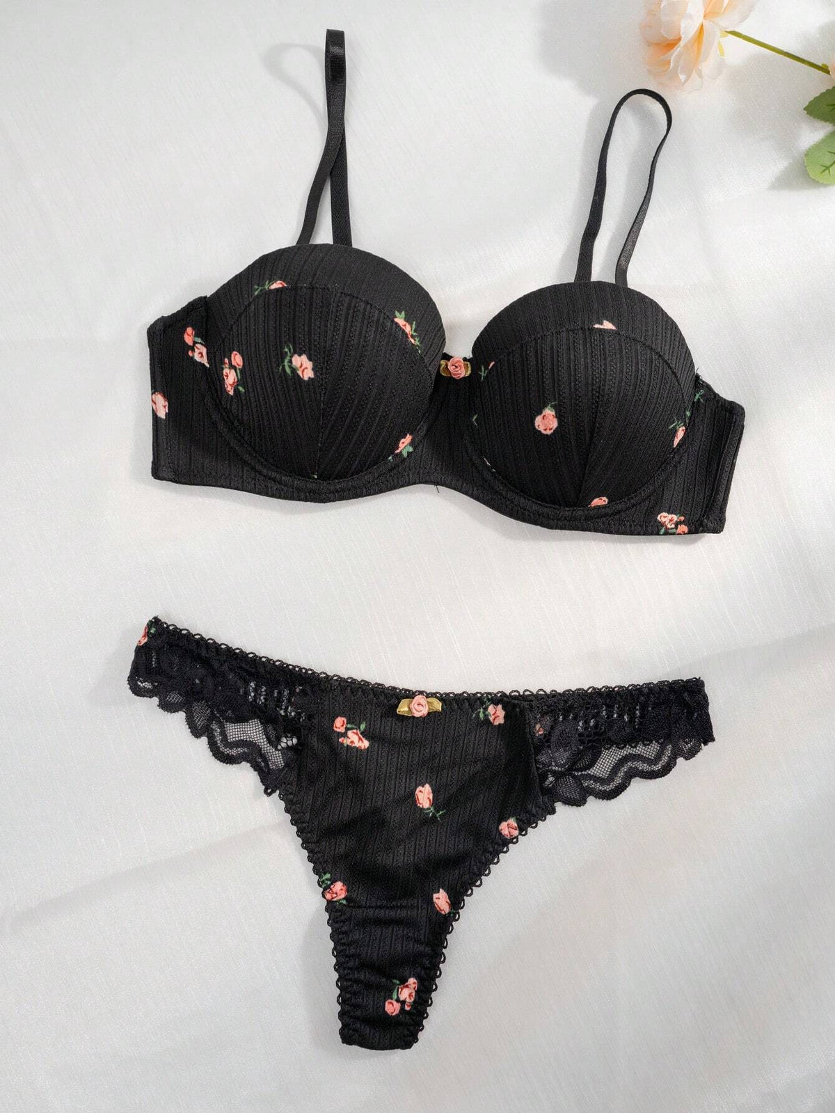 Inform when this item available Floral Print Lettuce Trim Underwire Bra & Panty Lingerie Set