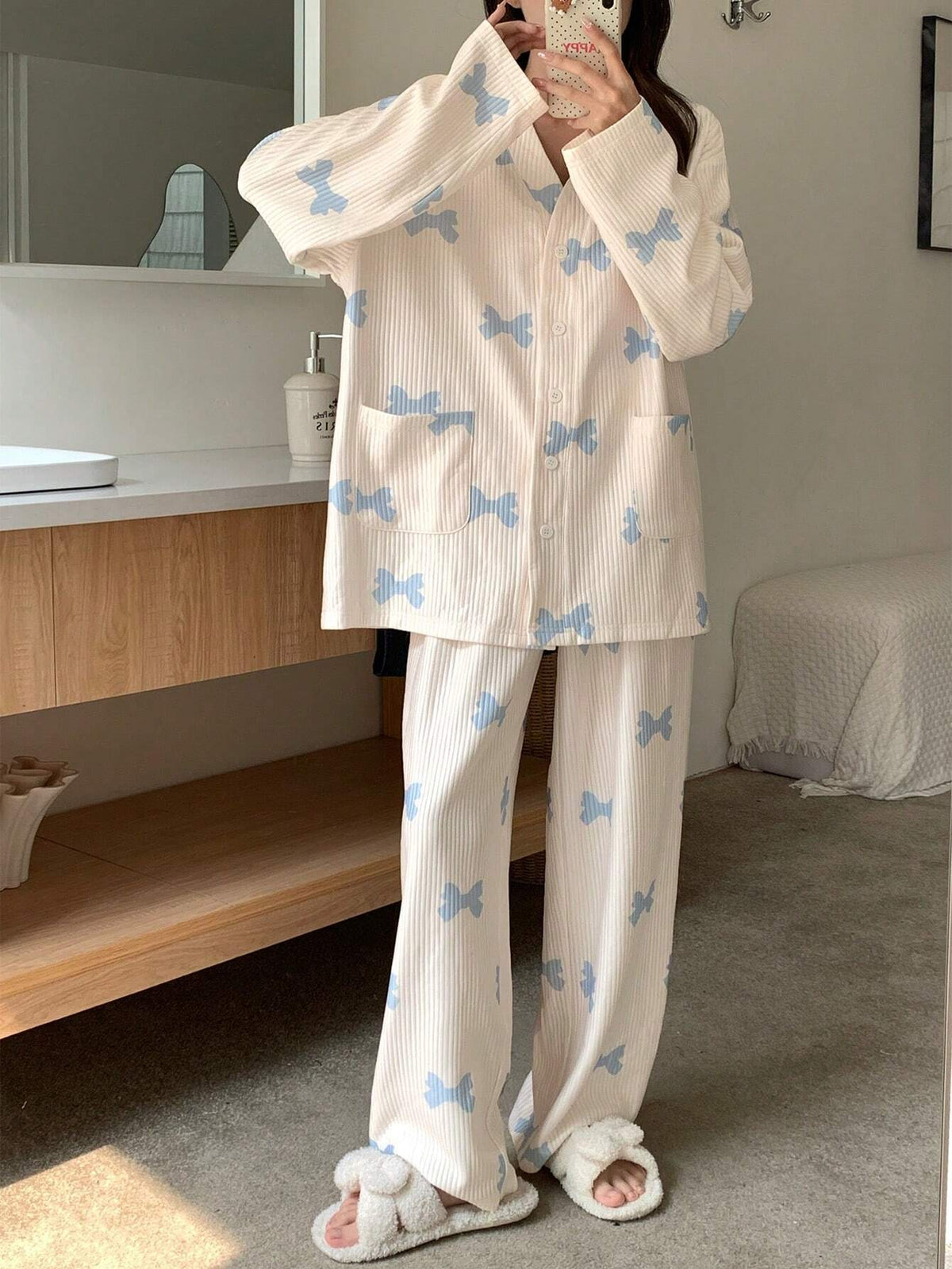 Inform when this item available DAZY Winter Striped Textured Cute Bow Pattern Print Cardigan Pajamas Set