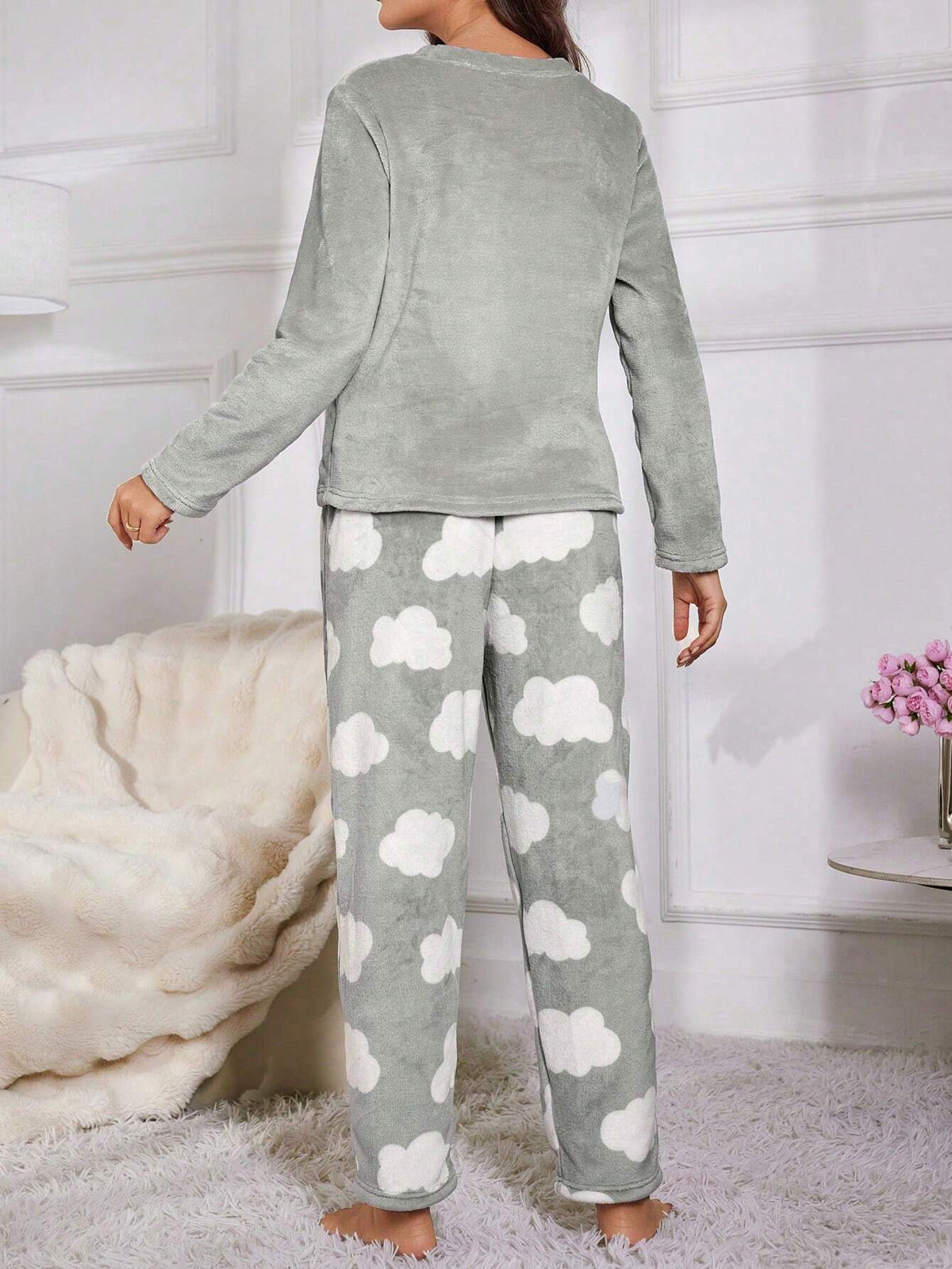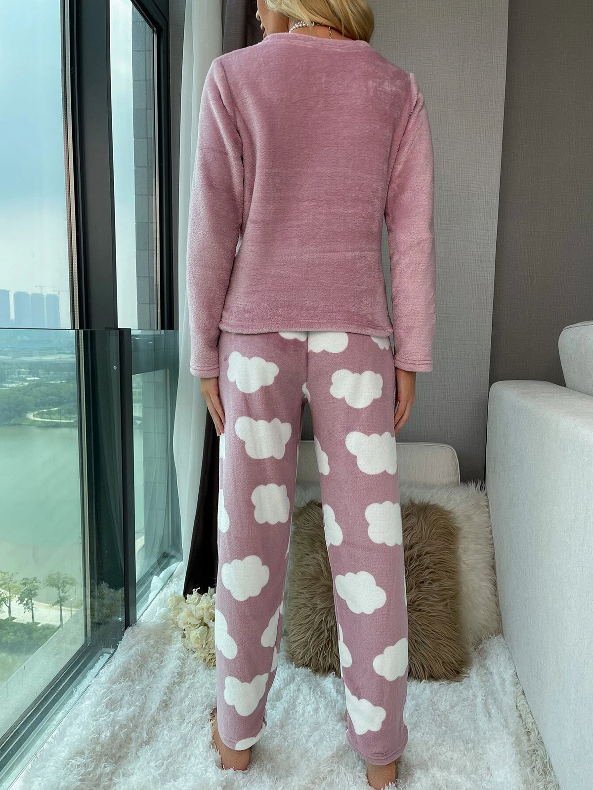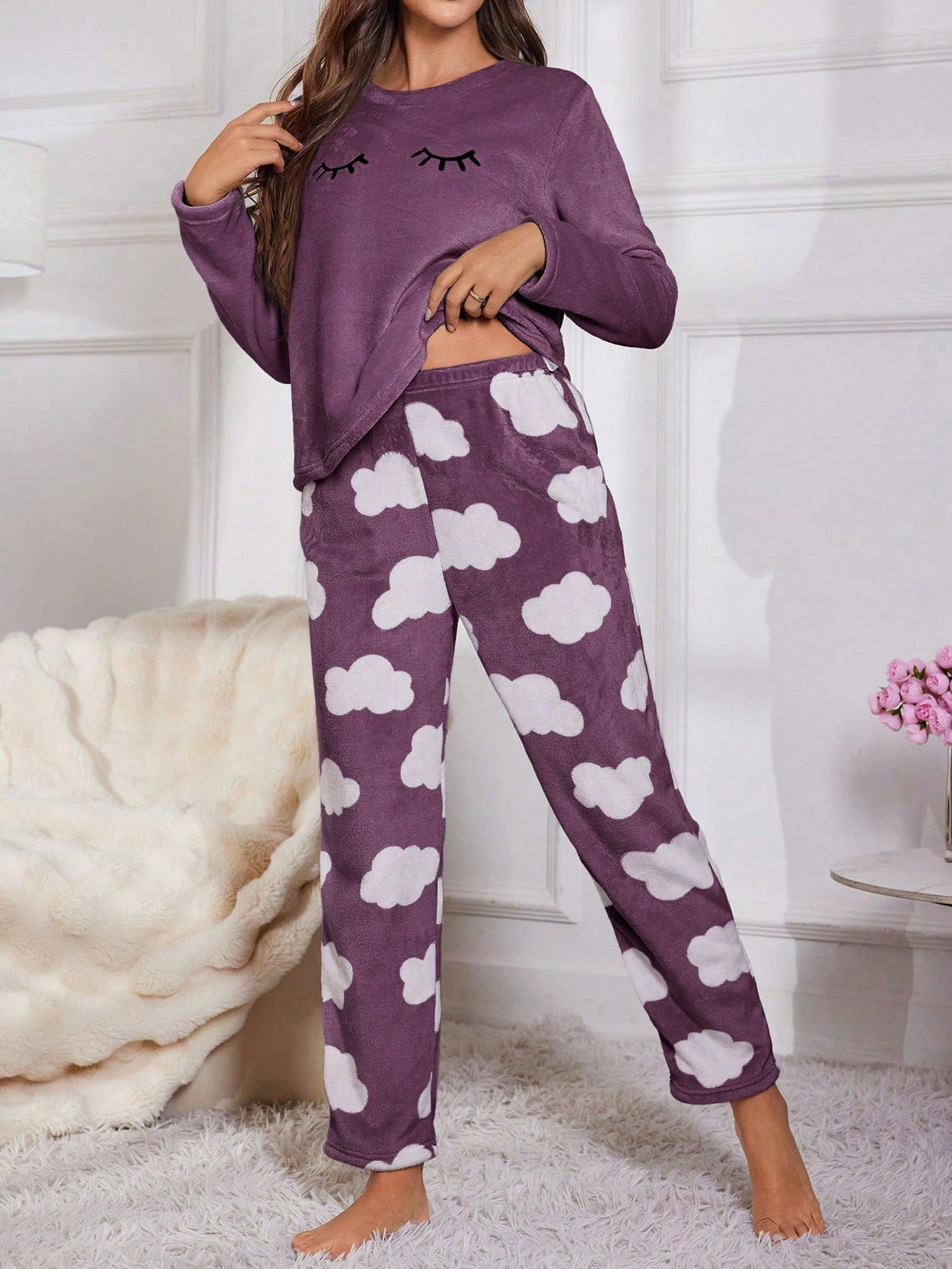 Inform when this item available Eyelash Embroidery Flannel Long Sleeve Pajama Set