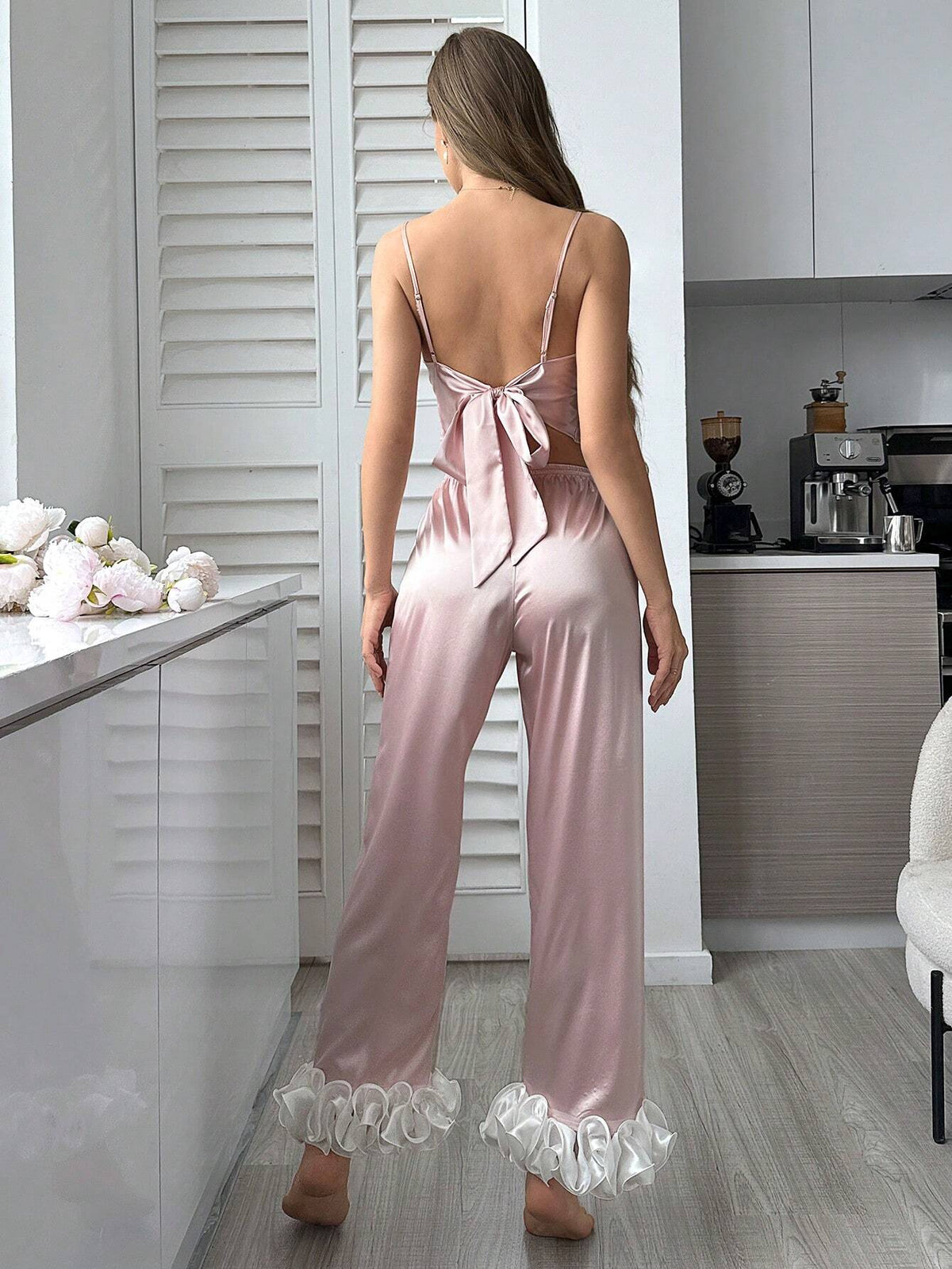Inform when this item available SilkySpell Simulated Silk Knotted Strap Contrasting Color 3D Flower Print Pajama Set With Long Pants