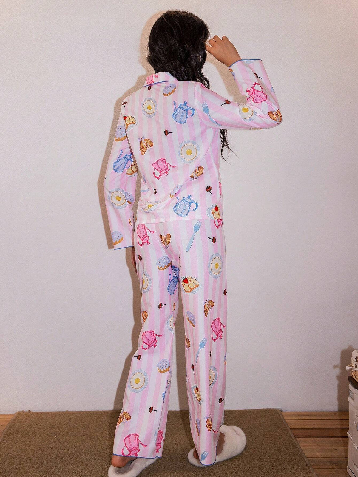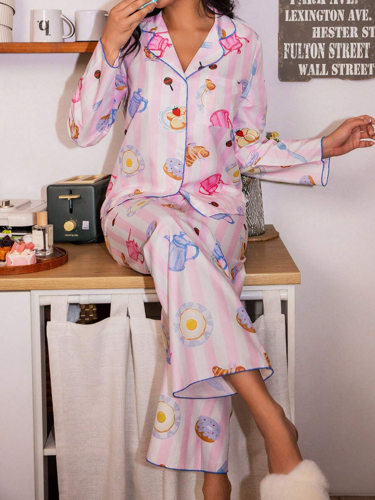 Inform when this item available Women Contrast Trim Front Button Long Sleeve Printed Casual Top And Long Pants